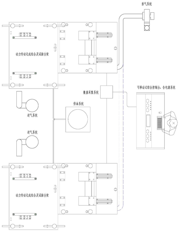 動力傳動組合試驗系統(tǒng)布置方案如圖所示: